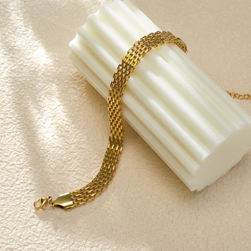 The Queen Mesh Bracelet leans into structure and texture through its finely woven mesh surface. Crafted from 18K gold plated 316L stainless steel, it balances softness in design with strength in material. The mesh pattern reflects light in a subtle way, which gives the wrist a refined finish without overpowering other pieces.